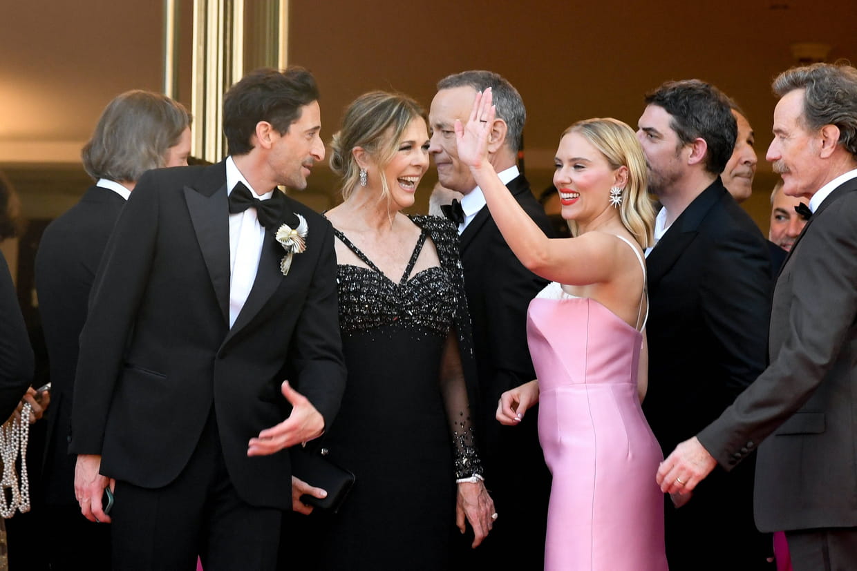 A la montée des marches avant la projection du film Asteroid City, Rita Wilson, Tom Hanks, Bryan Cranston, Maya Hawke, Wes Anderson, Adrien Brody et Scarlett Johansson semblaient très enjoués...