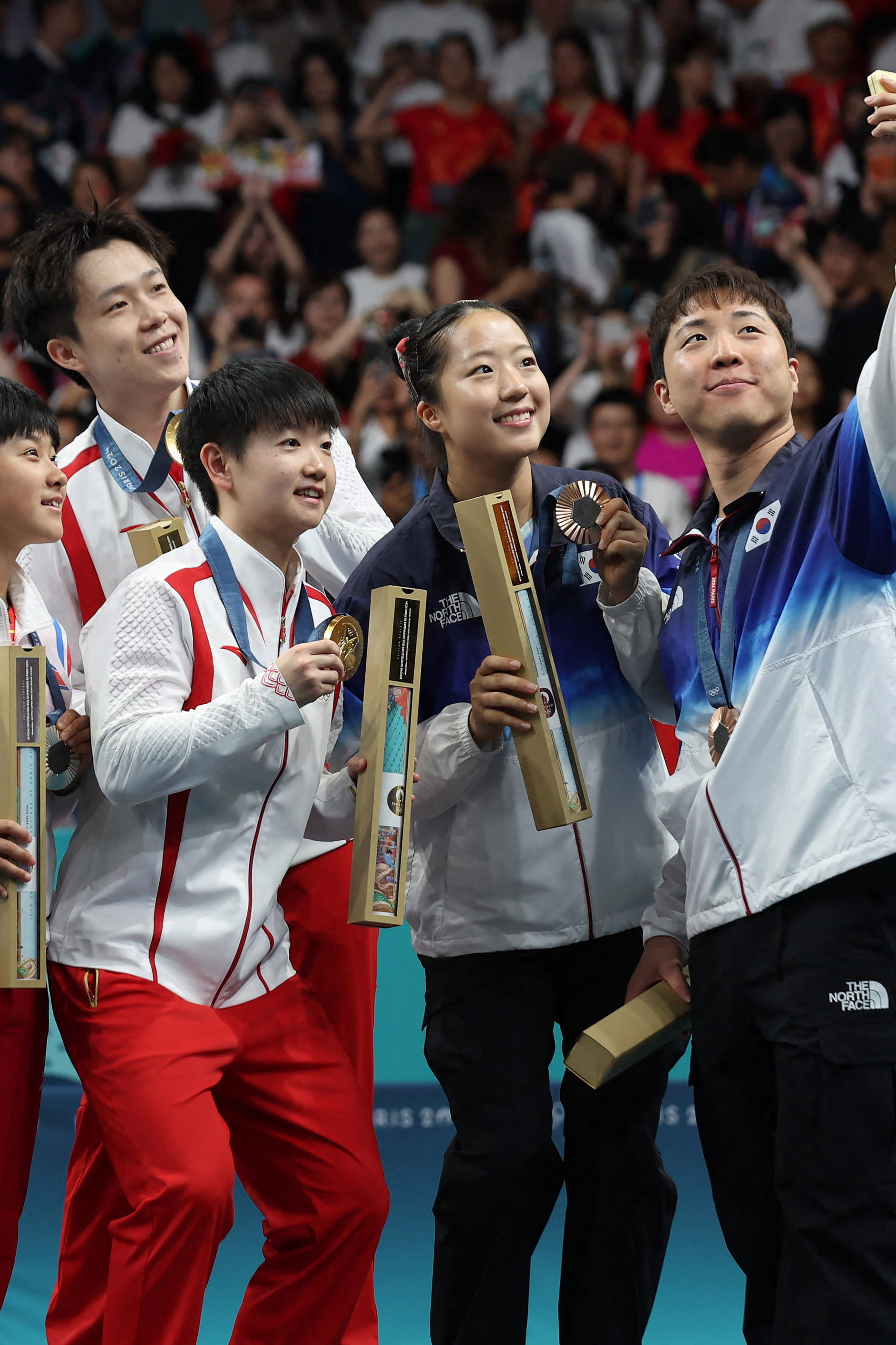 Alors que la Corée du Nord et la Corée du Sud ont tous deux été médaillés au double mixte de tennis de table, le Sud-Coréen Lim Jong-hoon, a pris uns selfie avec sa coéquipière, mais aussi la paire nord-coréenne vice-championne olympique, Ri Jong Sik et Kim Kum Yong ! Rappelons que les deux pays sont toujours en guerre début le conflit armé qui a duré de 1950 à 1953.