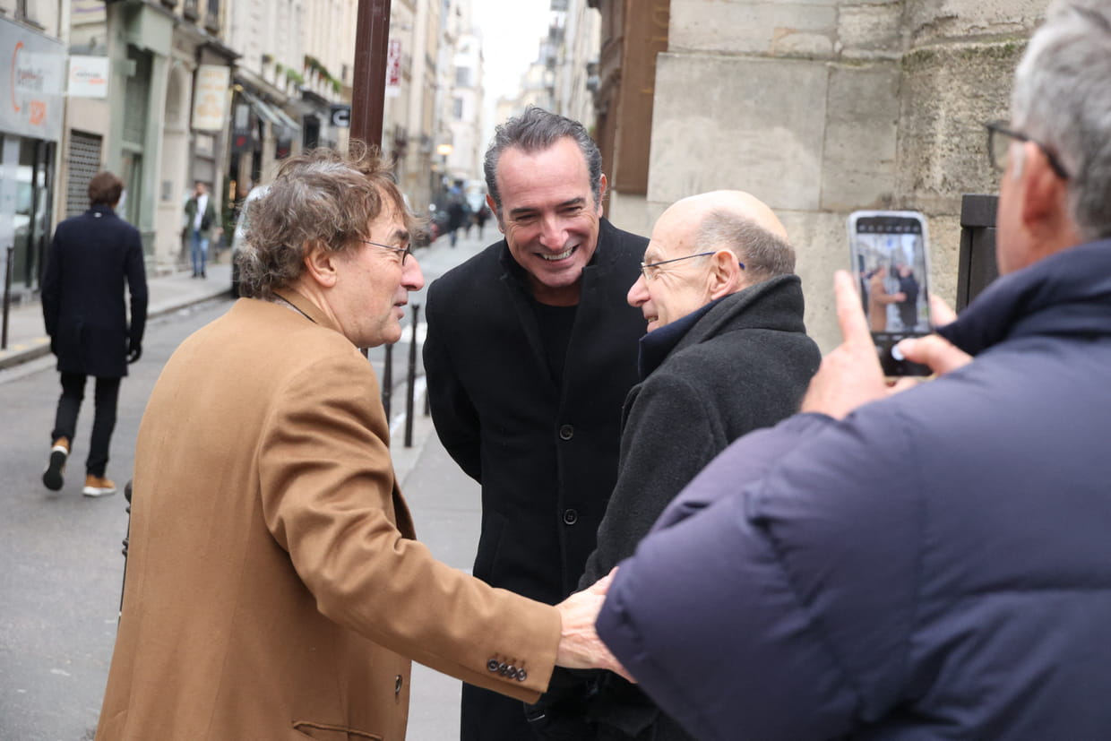 Jean Dujardin, Albert Dupontel et Didier Benureau, heureux de se retrouver aux obsèques de Bertrand Blier