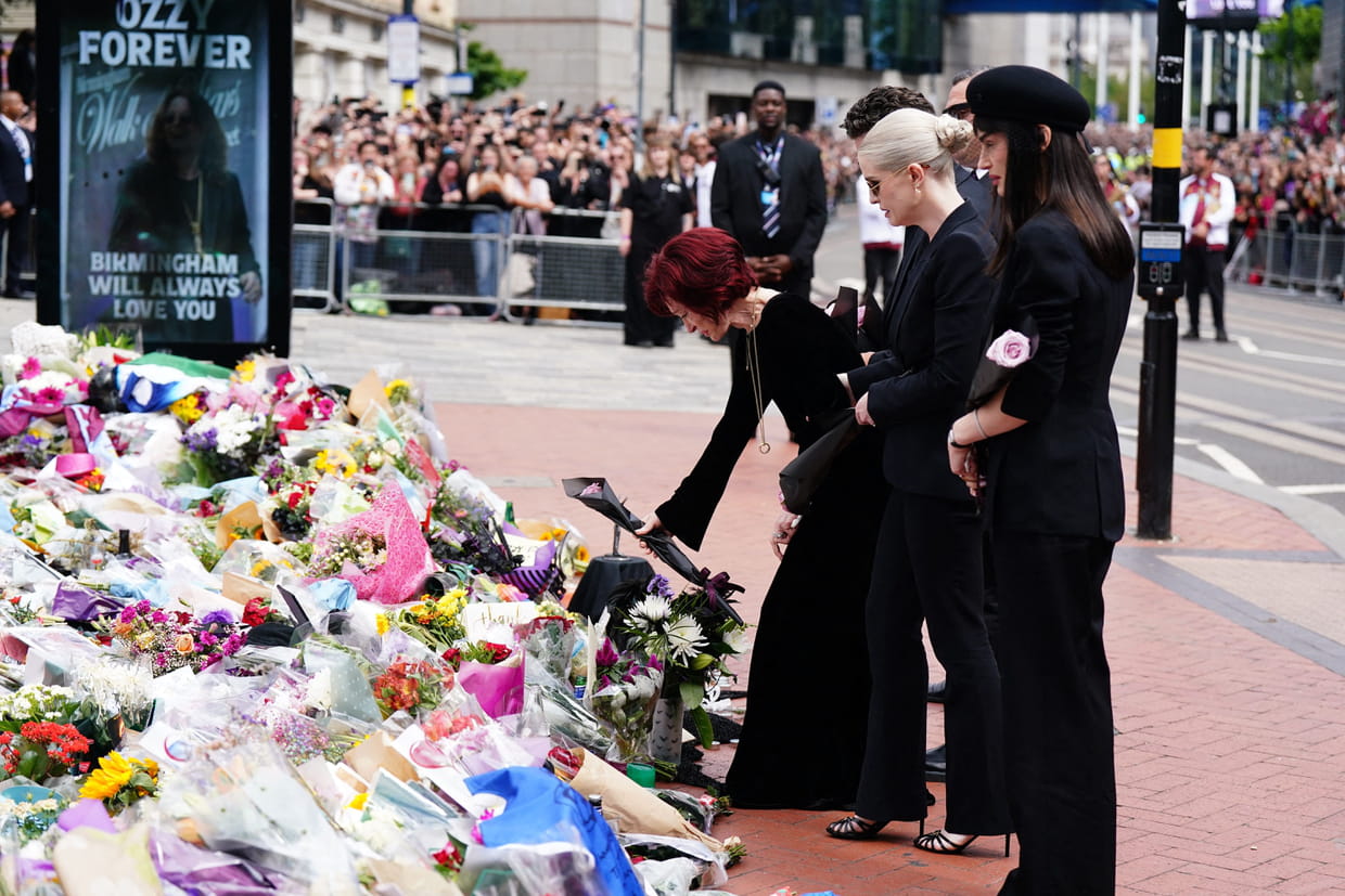 Sharon Osbourne était entourée de ses enfants, Jack, 39 ans, Kelly, 40 ans, et Aimee, 41 ans, pour les obsèques de celui avec qui elle était mariée depuis 1982. Une procession funéraire a d'abord eu lieu à Birmingham, en Angleterre, jusqu'au Black Sabbath Bridge, un endroit érigé en l'honneur du groupe dont Ozzy Osbourne était le leader, et où l'on trouve des fleurs et autres messages de fans.