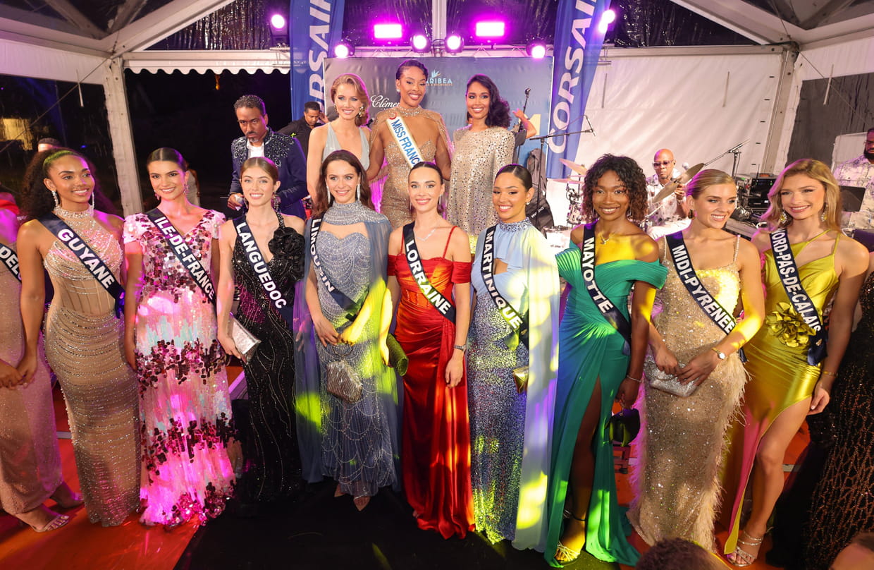 Angélique Angarni-Filopon, actuelle Miss France, entourée des anciennes Miss Amandine Petit et Clémence Botino - qui épaulent les candidates lors du voyage préparatoire - au gala donné pour les 30 miss régionales en Martinique.