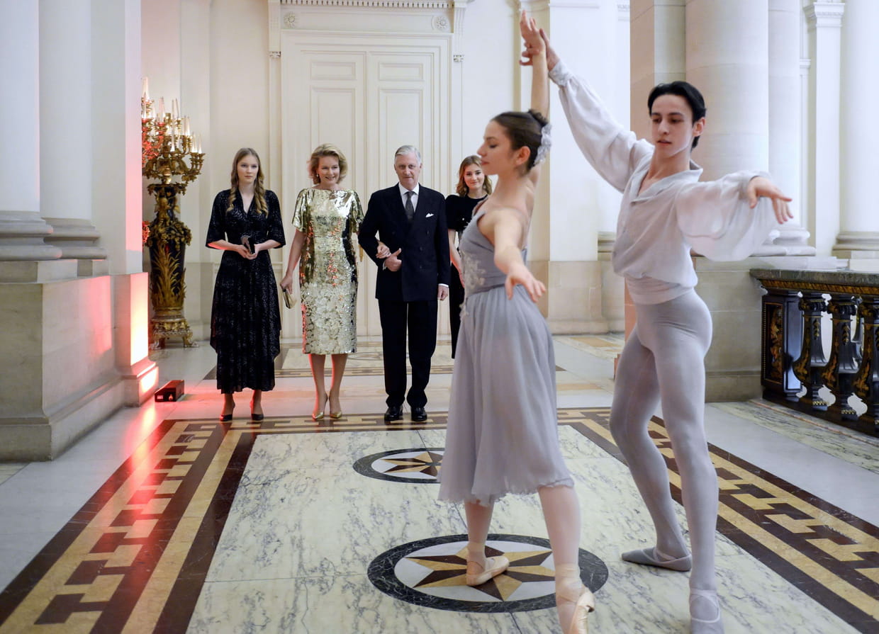 En se rendant à la salle du Trône, au palais royal de Bruxelles, Mathilde, Philippe, Eléonore et Elisabeth de Belgique ont croisé deux danseurs de ballet et semblaient captivés par le spectacle.