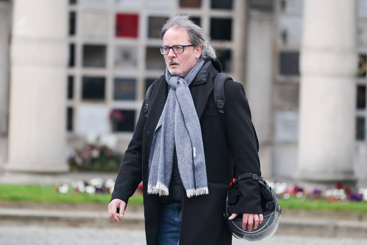 Christophe Alévêque arrive aux obsèques d'Isabelle Mergault