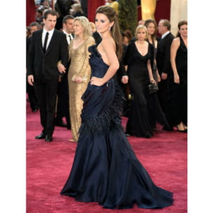 C'est spécialement pour la belle espagnole que Karl Lagerfeld a créé cette robe fourreau bleu-nuit en organza. Rebrodée de plumes et serrée à la taille, elle donne à Penélope Cruz une allure de reine.