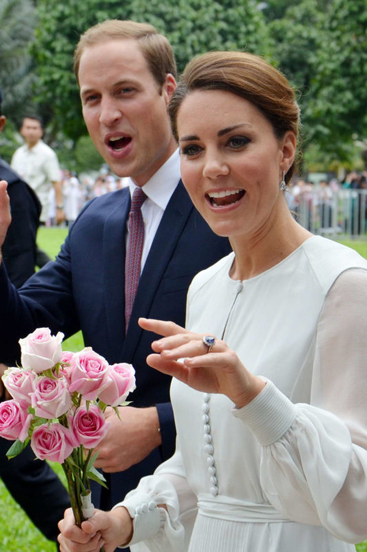 Alors que les seins de Kate défraient la chronique dans les journaux people, en septembre 2012, le couple est en visite officielle en Asie du Sud-Est dans le cadre du jubilé de Diamant de la reine Elisabeth II. Kate et William saluent ici la foule dans un parc de Kuala Lumpur en Malaisie. La duchesse porte une robe blanche presque virginale. Était-elle déjà enceinte à ce moment ? A en croire l'annonce officielle faite récemment, c'est certainement le cas !