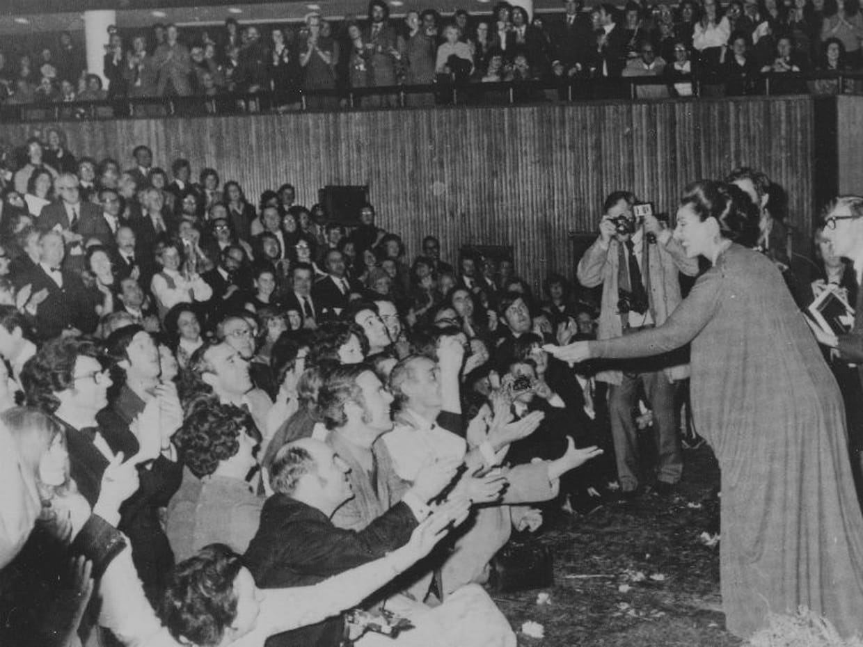 Maria Callas ovationnée après une prestation au Royal Festival Hall à Londres, en 1973, à l'occasion de son cinquantième anniversaire.