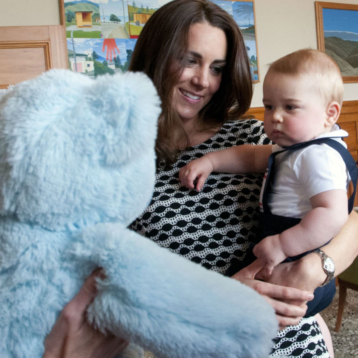 Le garçon n'est pas docile et ne se jette pas dans les bras de n'importe qui ! Seule Kate a ce privilège. Le 9 avril, un gros ours en peluche bleu a ouvert les pattes en direction de bébé George, dans le palais du gouvernement de Nouvelle-Zélande à Wellington... mais le petit n'était pas vraiment bleu de lui.