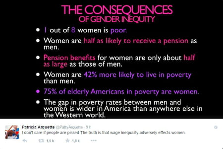 "Nous nous sommes battues pour l’égalité des droits des autres, voici venu le temps pour nous les femmes d’obtenir l’égalité salariale aux Etats-Unis." Ce sermon est issu du discours de remerciements de Patricia Arquette aux Oscars.