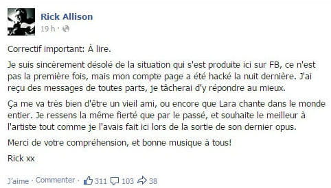 Depuis, les statuts incendiaires ont disparu du compte Facebook de Rick Allison. Ce dernier a affirmé être victime de piratage et s'est défendu dans un nouveau post: "Ça me va très bien d'être un vieil ami, ou encore que Lara chante dans le monde entier. Je ressens la même fierté que par le passé, et souhaite le meilleur à l'artiste[...]". Bizarre...