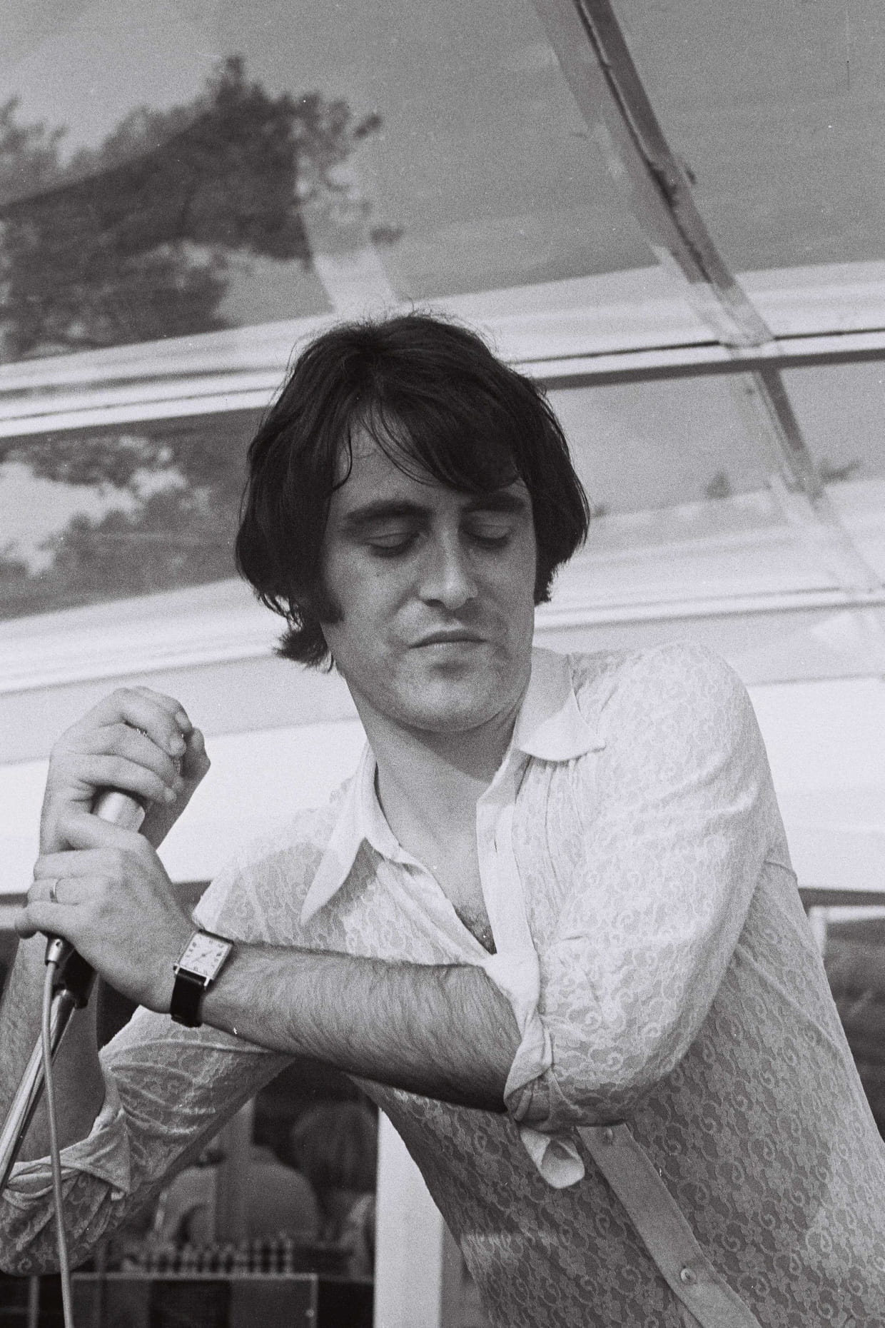 Michel Delpech chante sur le Bateau-mouche " La Galiotte", à Paris, en 1969.