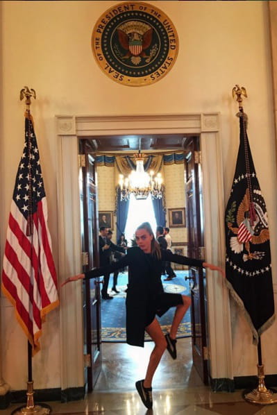 VIP. Cara Delevingne a eu l'honneur d'être invitée à la Maison-Blanche pour prendre part à une discussion sur le changement climatique. Et à cette occasion, le mannequin est resté plus que naturel : Cara a pris des poses toutes plus farfelues les unes que les autres et a fait son entrée en sneakers, celles que sa copine Rihanna a imaginées pour Puma. Osé !