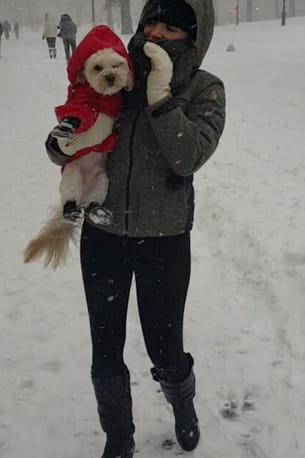 Ballade. La belle rouquine Jessica Chastain s'est laissée prendre par la tempête de neige avec son chien, habillé pour l'occasion !