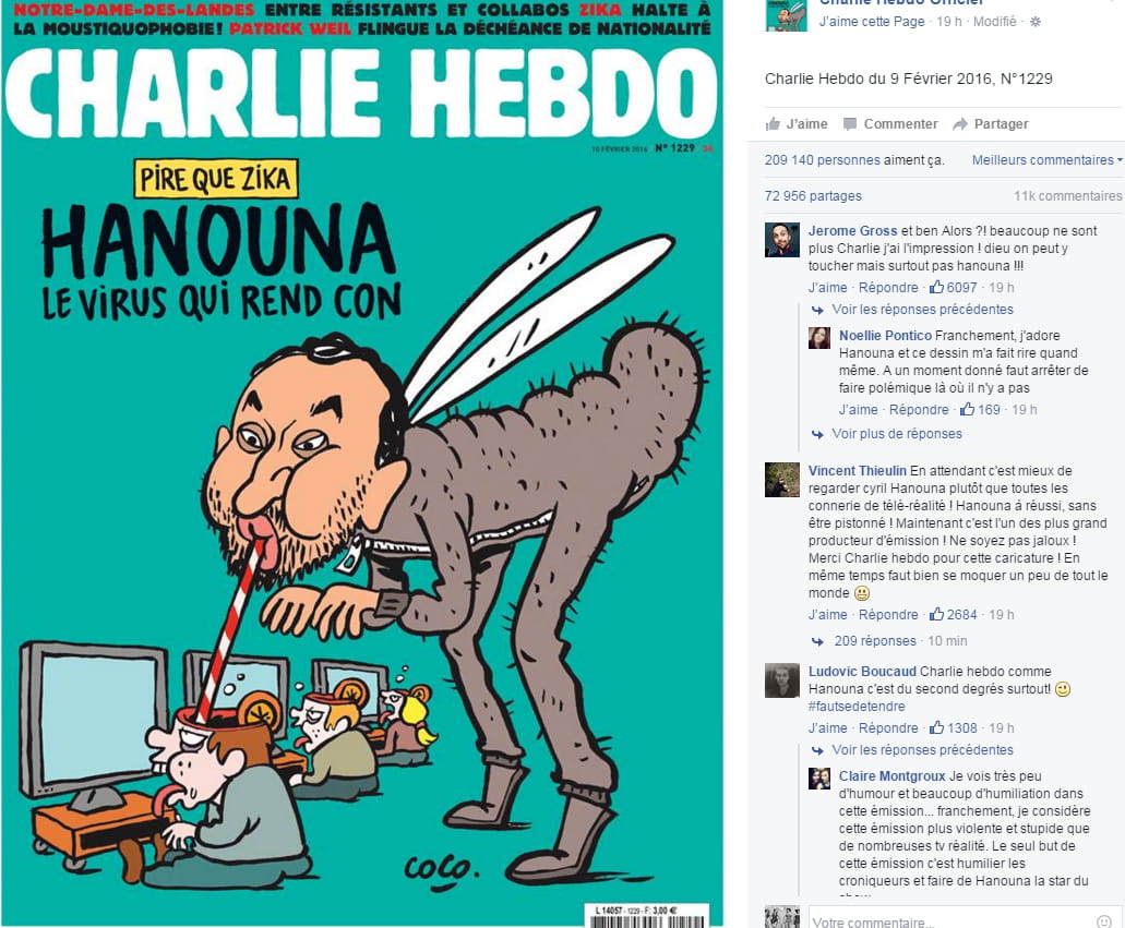 Tête de turc ? Après les nombreuses polémiques essuyées par l'équipe de Touche pas à mon Poste ces derniers temps, le journal satirique Charlie Hebdo s'en prend à l'animateur qu'il caricature en une du journal en moustique suceur de cerveaux. Le dessin est accompagné du le slogan "Hanouna, le virus qui rend con", en clin d'oeil au virus Zika. On a rit.