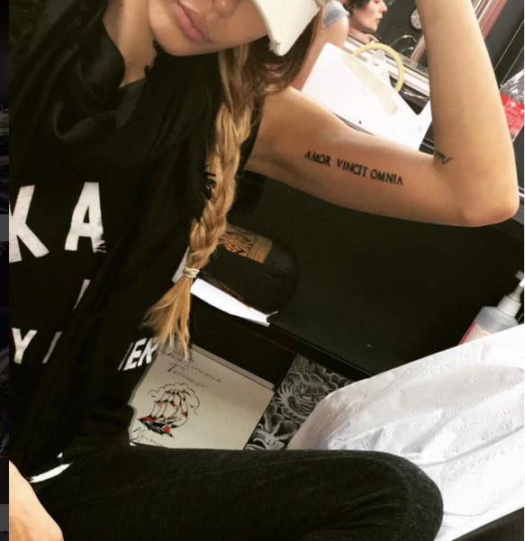 Dans la peau. Après avoir teasé ses abonnés Instagram en publiant une vidéo sur laquelle elle se fait tatouer, Nabilla a posté une photo de son nouveau dessin corporel dédié à Thomas Vergara, une citation latine qui signifie "l'amour triomphe de tout". Même des coups de couteau, visiblement