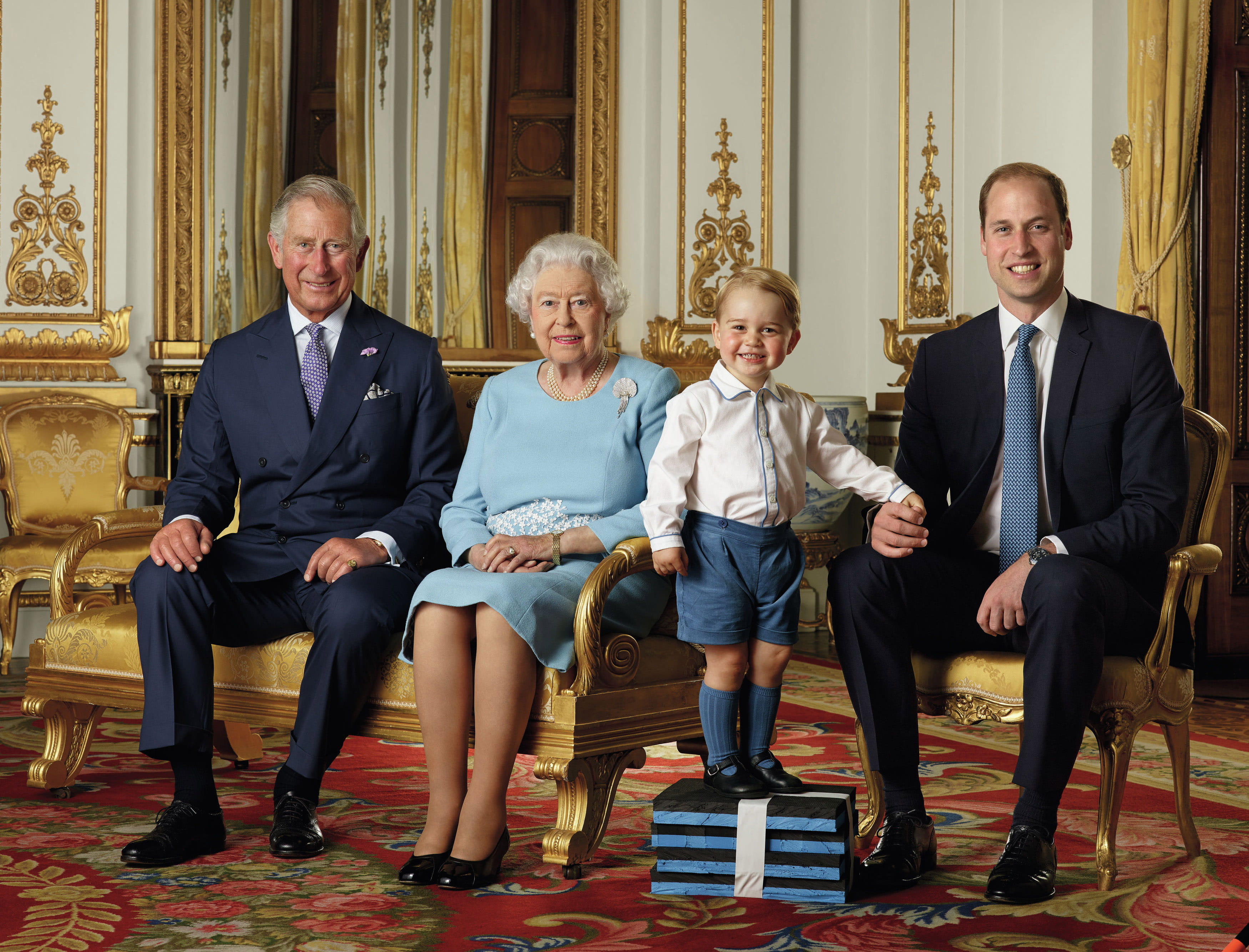 Une photo, quatre générations. Pour la première fois, la reine Elisabeth a pris la pose avec son fils Charles, son petit-fils William et son arrière-petit-fils George. Ce dernier, adorable comme à l'accoutumée, se tient debout sur une pile de livres. Une bouille que les Britanniques pourront bientôt retrouver sur leurs timbres, comme celles de ceux qui l'accompagnent, pour une série spécialement créée pour les 90 ans de la reine.