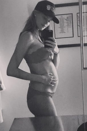 Ça pousse. Sur son compte Instagram, Behati Prinsloo a posté un selfie sur lequel elle apparaît en sous-vêtements, dévoilant ainsi son petit ventre rond. L'Ange Victoria's Secret et le chanteur Adam Levine devraient accueillir leur premier enfant durant l'été 2016.