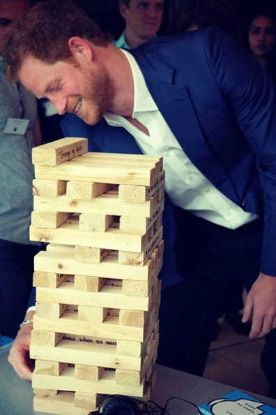 Agile. Le Prince Harry a prouvé son habilité en faisant une partie de jenga, ce jeu qui consiste à déplacer les pièces d'une tour pour la faire grandir sans qu'elle ne s'effondre. Le compte Instagram du palais de Kensington a posté une photo sur laquelle le prince joue les bâtisseurs. Finger in the nose !