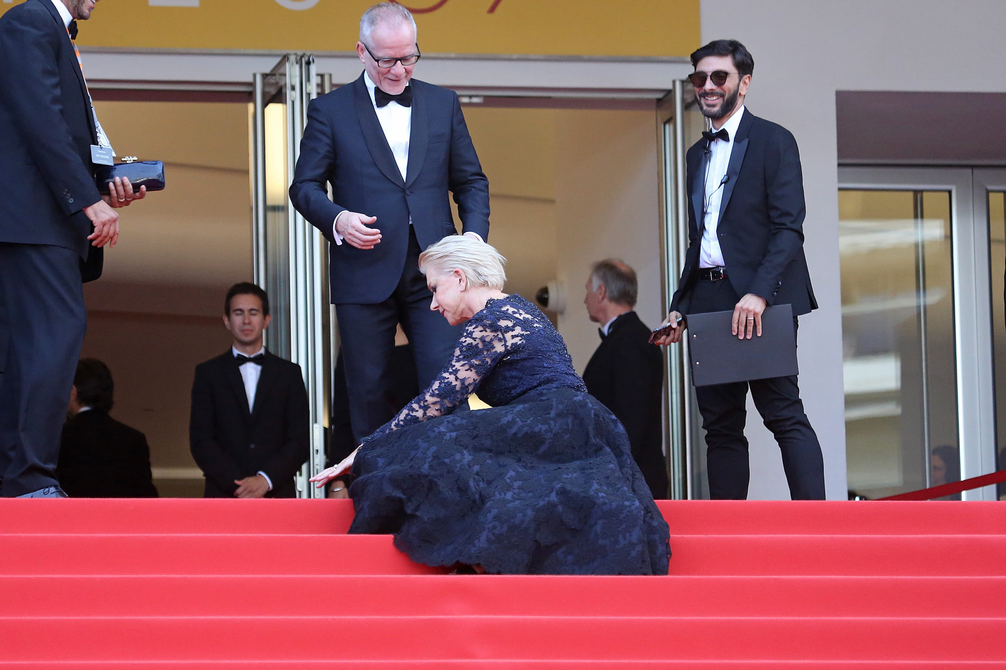 Oups. L'actrice britannique Helen Mirren est tombée sur le tapis rouge alors qu'elle montait les marches à Cannes pour La Fille Inconnue des frères Dardenne. Heureusement, rien de cassé et, en plus, même sa chute est élégante.