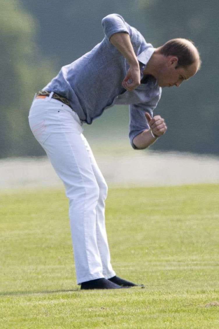 Échauffement. Mais que fait donc le prince William ? Le mari de Kate Middleton s'est livré à quelques mouvement étonnants sur le green de Berkshire. Le duc de Cambridge s'échauffait juste pour un match de Polo.