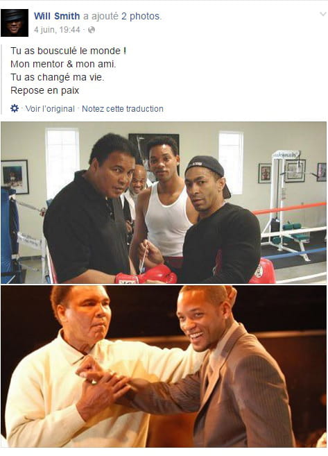 Décès. Will Smith a été choisi par la famille de Mohamed Ali pour porter le cercueil du boxeur lors de ses obsèques. Il faut dire que les deux hommes étaient très proches depuis que l'acteur avait tourné dans Ali de Michael Mann en 2001. Il a d'ailleurs témoigné de sa grande tristesse, à l'annonce du décès de "The Greatest", sur Facebook : "Tu as bousculé le monde ! Mon mentor & mon ami. Tu as changé ma vie. Repose en paix."