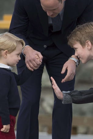 Coquin. Le prince George se serait-il assagi ? Turbulent d'après ses parents, il a joué les timides au moment de quitter le Canada. Face à un petit garçon voulant lui taper dans la main, George a rougi et s'est retourné vers son père. On mettra cette mésaventure sur le compte de la fatigue qu'on lui pardonne déjà.
