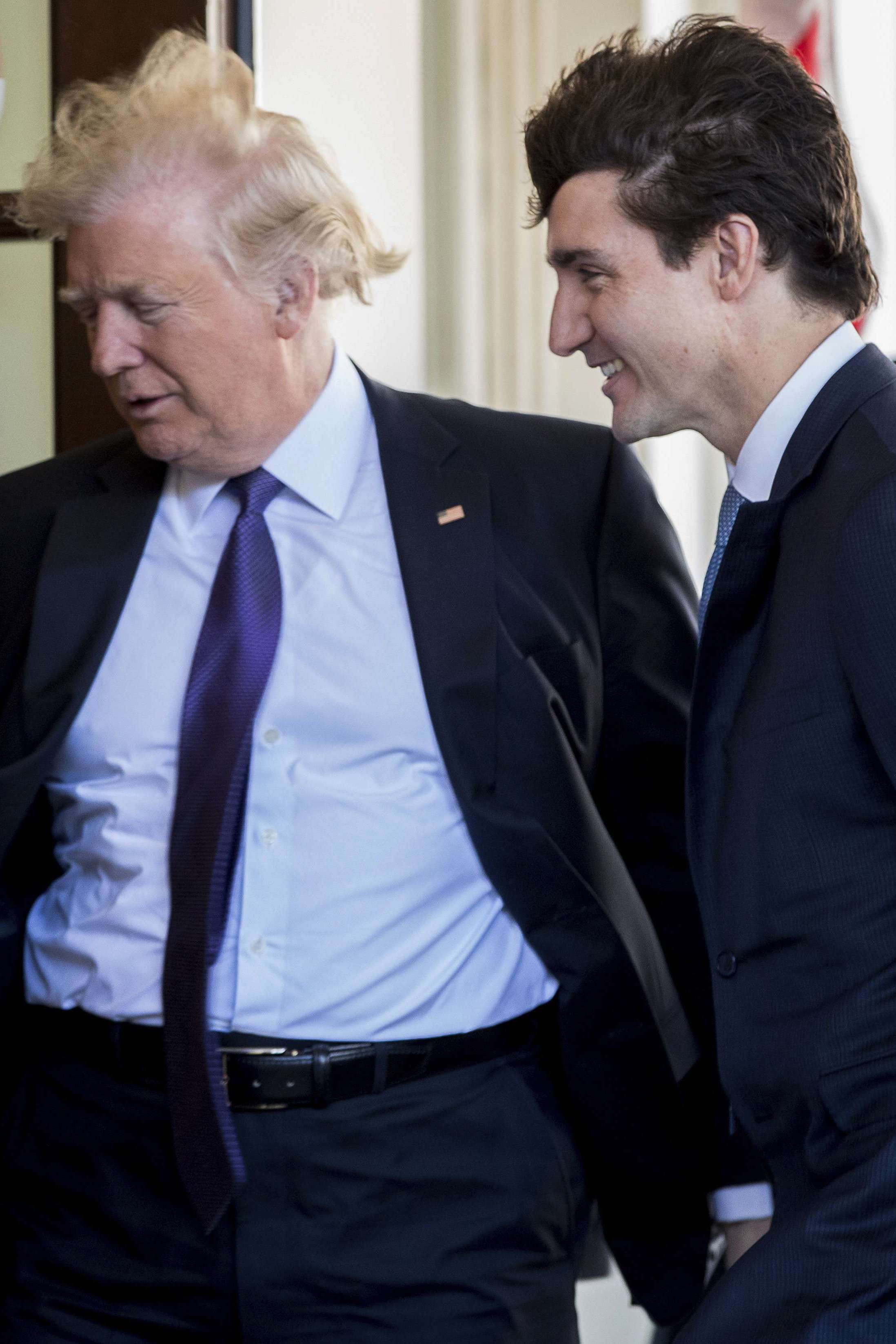Ça décoiffe. Lors de sa rencontre avec le premier Ministre canadien Justin Trudeau, Donald Trump s'est pris le vent de plein fouet…révélant ainsi la démarcation entre sa peau pâle et son autobronzant disgracieux. Bonne nouvelle : au moins, ses cheveux sont bien réels…