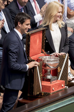 Victoire. On a trouvé ! Si Nicole Kidman était présente lors de la finale de Roland Garros, c'était (aussi) pour présenter la coupe des Mousquetaires, en duo avec Tony Estanguet, champion olympique français de canoë. A noter, pour la première fois de l'histoire du tournoi, le trophée avait pour écrin une "malle" confectionnée par la maison Louis Vuitton. Classe !