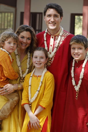 Voyage en famille. Justin Trudeau s'est envolé pour l'Inde avec sa femme Sophie et leurs enfants Xavier, 10 ans, Ella-Grace, 9 ans, et Hadrien, 3 ans. Après une visite du Taj Mahal, le Premier ministre canadien a emmené sa famille au Temple d'or d'Amritsar, au Nord-Ouest du pays, où ils ont cuisiné du "chapati", un pain sans levain, dans une cuisine collective. Les Trudeau étaient tous vêtus de vêtements traditionnels indiens, s'il vous plait !