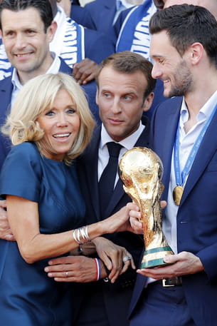 Sous les ors. À leur retour de Russie, les Bleus se sont rendus à l'Élysée pour célébrer leur victoire. Emmanuel et Brigitte Macron ont félicité l'équipe de France sur le perron, avant de les accueillir au Palais, le temps d'un dîner. La première dame a même eu l'occasion de soulever la très convoitée Coupe du monde.