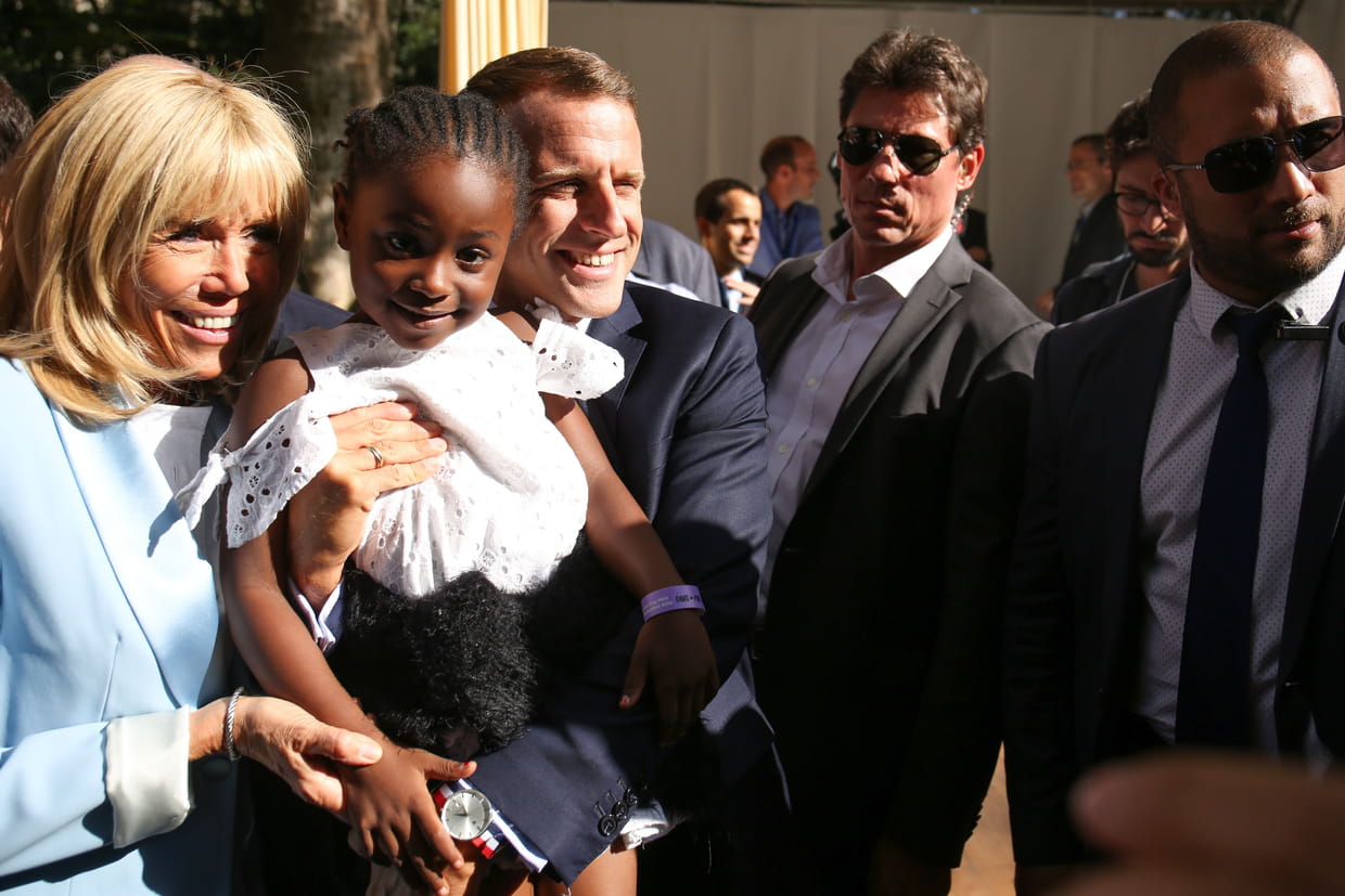 Emmanuel et Brigitte Macron avec une enfant lors des portes ouvertes de l'Elysée (Journées du Patrimoine).