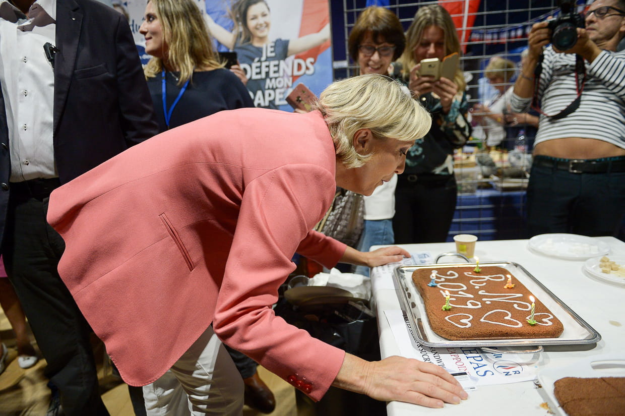 Marine Le Pen à l'occasion de la Fête du Drapeau qui rassemblait les fédérations du Rassemblement National à à la salle Jacques Brel de Mantes-la-Ville en Île-de-France.