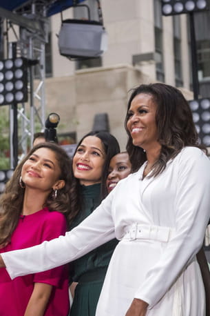 Michelle Obama, Freida Pinto et Zendaya, au Rockefeller Plaza pour la Journée Internationale des filles © Charles Sykes/AP/SIPA
