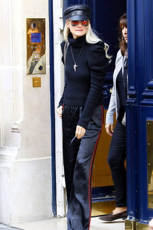 Joue pas de rock'n'roll pour moi. Laeticia Hallyday s'est rendue à un rendez-vous chez son avocat, Maître Amir Aslani, parée d'un look étonnant. Coiffée d'une casquette de motarde en cuir, vêtue d'un pantalon de jogging noir, la croix de Johnny autour du cou, la veuve du Taulier a rendu hommage à son défunt époux, qui aurait certainement apprécié cette tenue rock'n'roll. Noir, c'est noir…