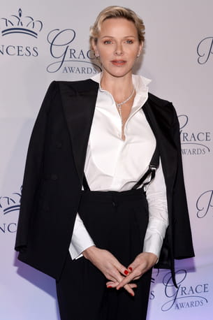 Élégance. Charlene de Monaco a fait une apparition remarquée aux Princess Grace Gala Awards, à New York. Vêtue d'une veste de tailleur noire posée sur ses épaules et d'une chemise blanche parée de bretelles, la princesse, qui est venue sans le prince Albert, a fait crépiter les flashes. Elle n'a besoin de personne…