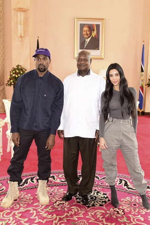 Au sommet. Kanye West et Kim Kardashian ont rencontré Yoweri Museveni, président d'Ouganda, au palais présidentiel d'Entebbe, près de la capitale Kampala. Selon le compte Twitter du chef d'Etat, qui aurait demandé à Kim Kardashian quel était son métier, le rappeur lui aurait offert des baskets blanches. Le rappeur s'était rendu dans le pays pour y enregistrer son prochain album Yandhi.