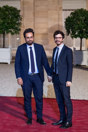 Ensemble. Mounir Mahjoubi, secrétaire d'Etat auprès du ministre de l'Économie, était accompagné par son époux depuis 13 ans Mickaël Jozefowicz, expert en financement, lors d'un dîner d'Etat avec le président de Corée du Sud, à l'Elysée. Les tourtereaux sont apparus main dans la main, sur le perron du Palais. Symbolique.