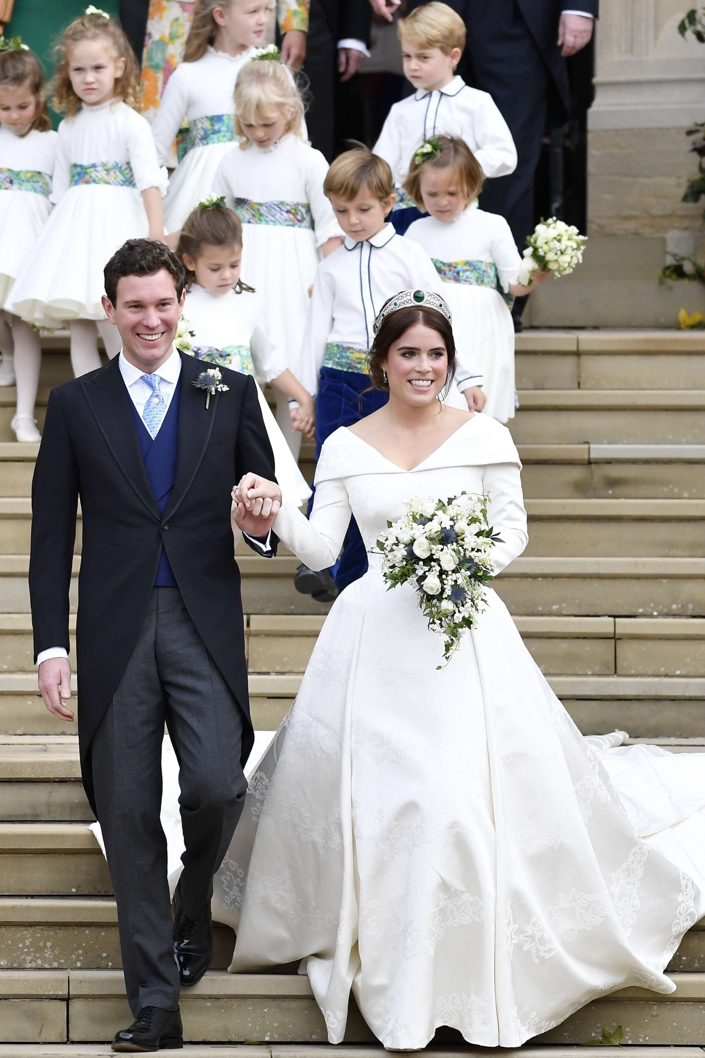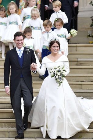 Cinq mois après son cousin germain Harry, la fille d'Andrew et de Sarah Ferguson, Eugénie d'York a uni son destin à celui de Jack Brooksbank à la Chapelle Saint-George du château de Windsor. Le 12 octobre 2018, leur union très venteuse a soulevé la robe d'une cousine de la mariée et fait s'envoler les chapeaux des invités.