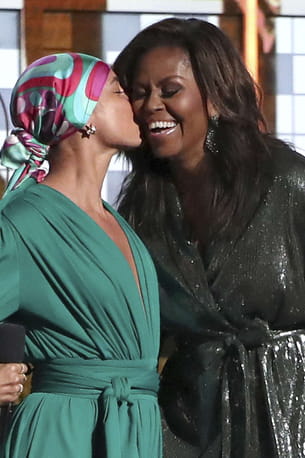 Une amie en or. Michelle Obama a fait une apparition surprise aux Grammy Awards, pour soutenir Alicia Keys, qui a animé la cérémonie. L'ancienne First Lady a débarqué sur la prestigieuse scène, accompagnée de Lady Gaga, Jada Pinkett Smith et Jennifer Lopez. "Une grande partie de l'amitié est d'être là pour vos copines : j'étais ravie d'être là pour Alicia Keys", lit-on sur le compte Twitter de l'épouse de Barack Obama.