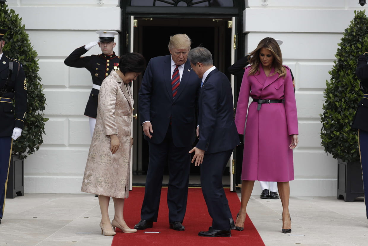 Ici, en visite à Washington, le président sud-coréen et son épouse ont eu du mal à trouver la bonne place aux côtés de Donald et Melania Trump pour les photos officielles.