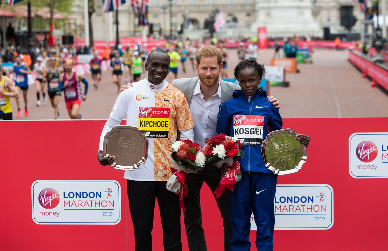 Le Prince Harry pose avec les deux grands gagnants du marathon à Londres