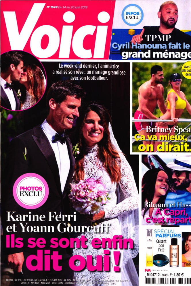 La robe de sa vie. Karine Ferri a dit "oui" à Yoann Gourcuff, père de ses enfants Maël, 3 ans, et Claudia, 11 mois, le 8 juin. Pour s'unir religieusement à l'élu de son cœur dans la petite église St-Victor, l'animatrice de 37 ans portait une magnifique robe en dentelle signée Celestina Agostino, d'une valeur de 10 000 euros, et était parée de bijoux Cartier, rapporte Ici Paris. Lors de la cérémonie civile, elle était vêtue d'une robe courte dos-nu Elisabetta Franchi et était chaussée d'escarpins Valentino. Quant au jeune marié, il est apparu en costume Giorgio Armani.