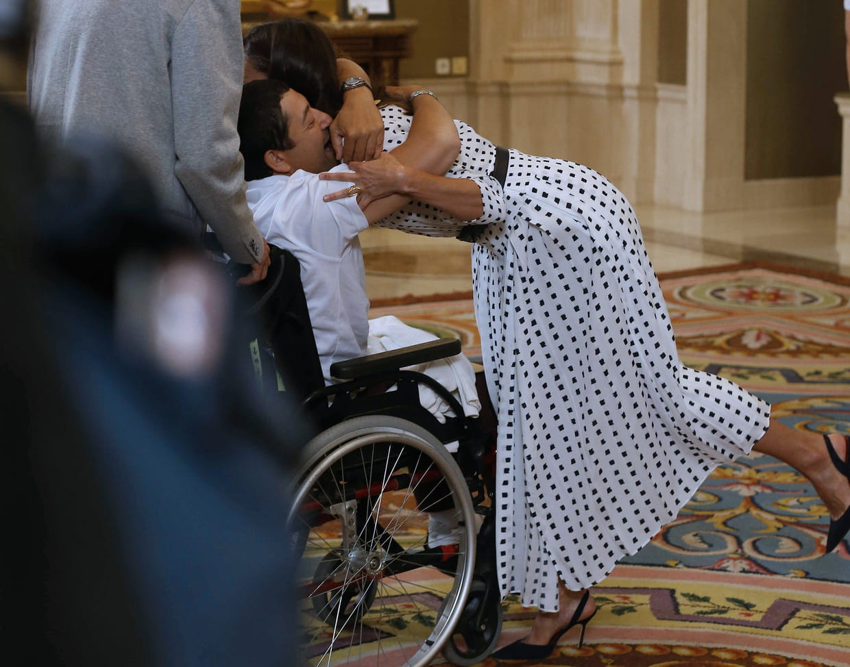 La reine d'Espagne enlace un homme en fauteuil roulant