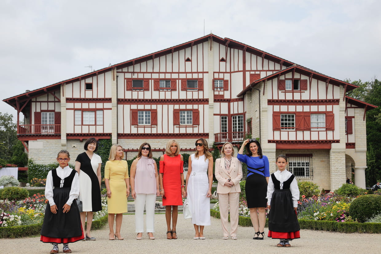 Brigitte Macron et les premières dames lors d'une visite à Combo-les-Bains le 25 août 2019. De gauche à droite : Akie Abe (Japon), Małgorzata Tusk, la femme de Donald Dusk (président du Conseil Européen), Jenny Morrison (Australie), Brigitte Macron, Cecilia Morel (Chili), Adele Malpass, la femme du président de la Banque mondiale, et Melania Trump (Etats-Unis).