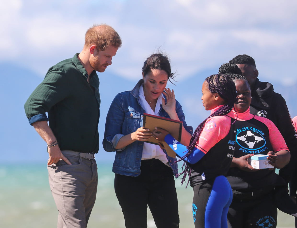 Mais, mais... c'est une veste en jean ? Harry et Meghan Markle sur la plage de  Monwabisi, en Afrique du Sud, le 24 septembre.