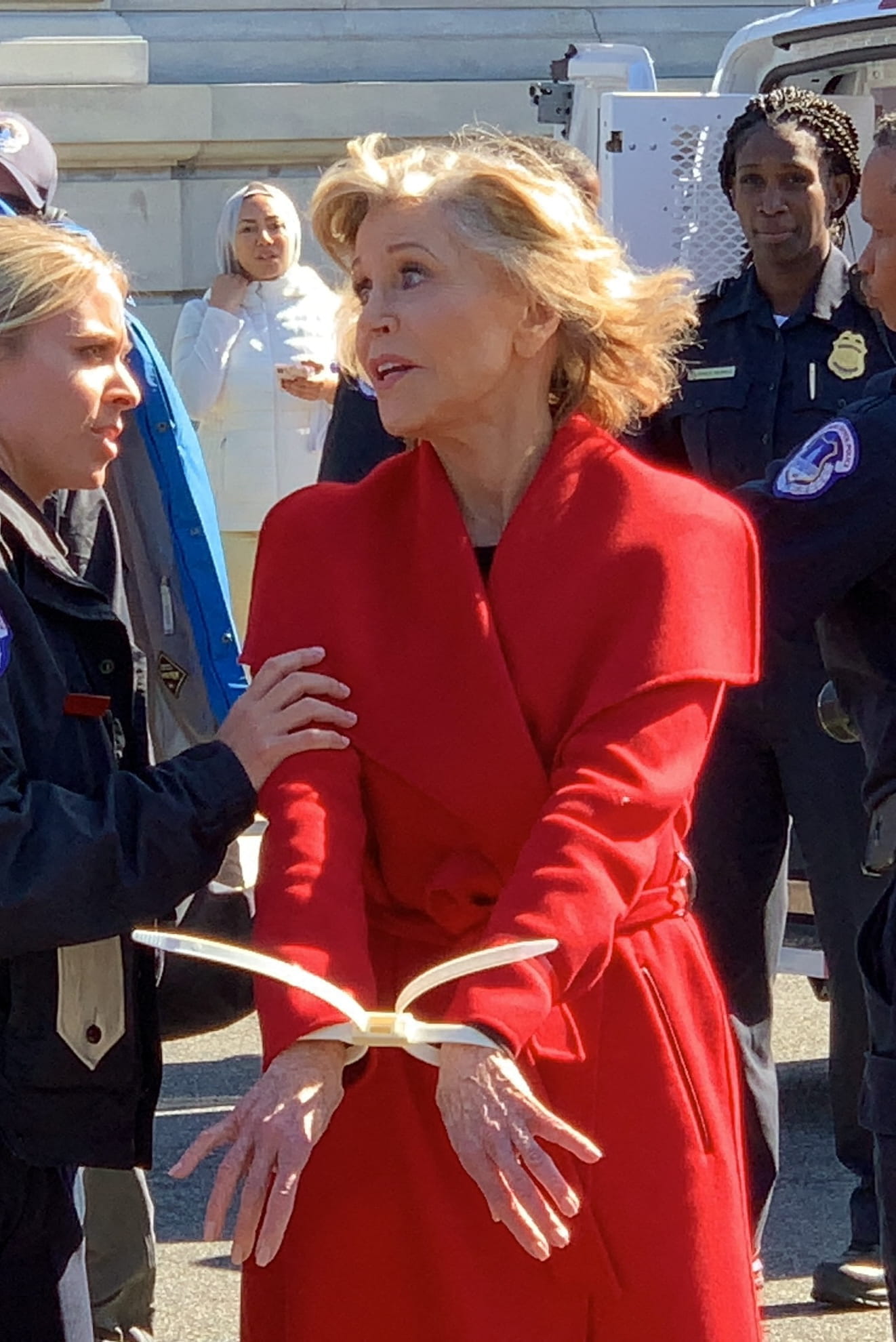 Engagement. Alors qu'elle militait pour la protection de l'environnement, de manière pacifiée, face au Congrès de Washington, Jane Fonda a été arrêtée par la police, le 17 octobre. L'actrice de 81 ans, interpellée aux côtés de 17 autres personnes, n'a pas protesté. La semaine précédente, la comédienne avait également été arrêtée par les forces de l'ordre lors d'un autre rassemblement au Capitole.