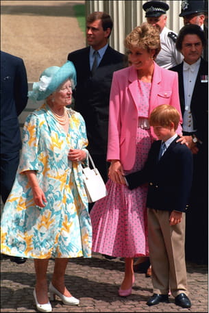 La reine mère, Lady Di et le prince Harry en 1992 © Keene Martin/PA Photos/ABACA