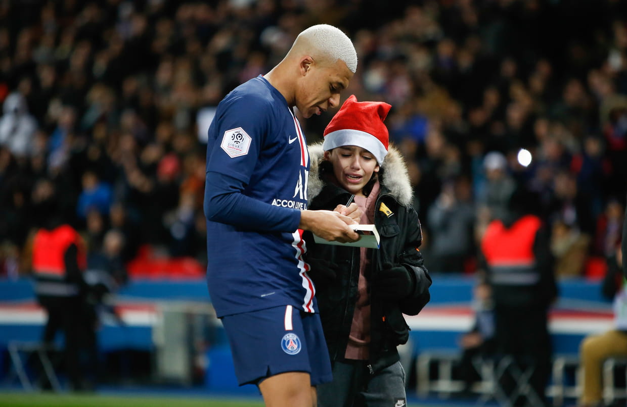 Kylian Mbappé signe un autographe pour un fan lors du match PSG-Amiens au Parc des Princes à Paris, le 21 décembre.