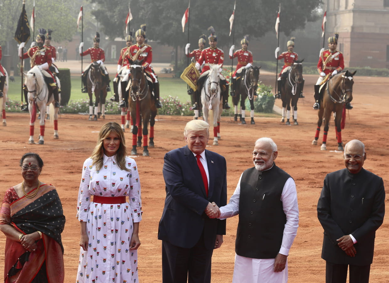 Le couple présidentiel américain en voyage en Inde, ici à New Delhi le 25 février, avec le premier ministre indien Narendra Modi, le Président indien Ram Nath Kovind et sa femme Savita Kovind.