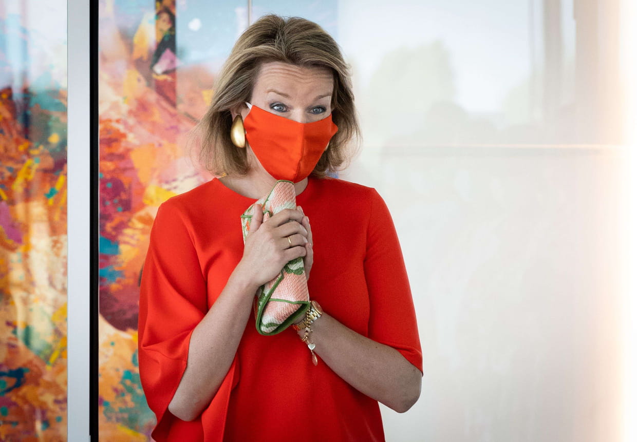 La reine Mathilde de Belgique lors d'une visite à plusieurs femmes auto-entrepreneurs le 28 mai à Oostnieuwkerke dans la province de Flandre-Occidentale