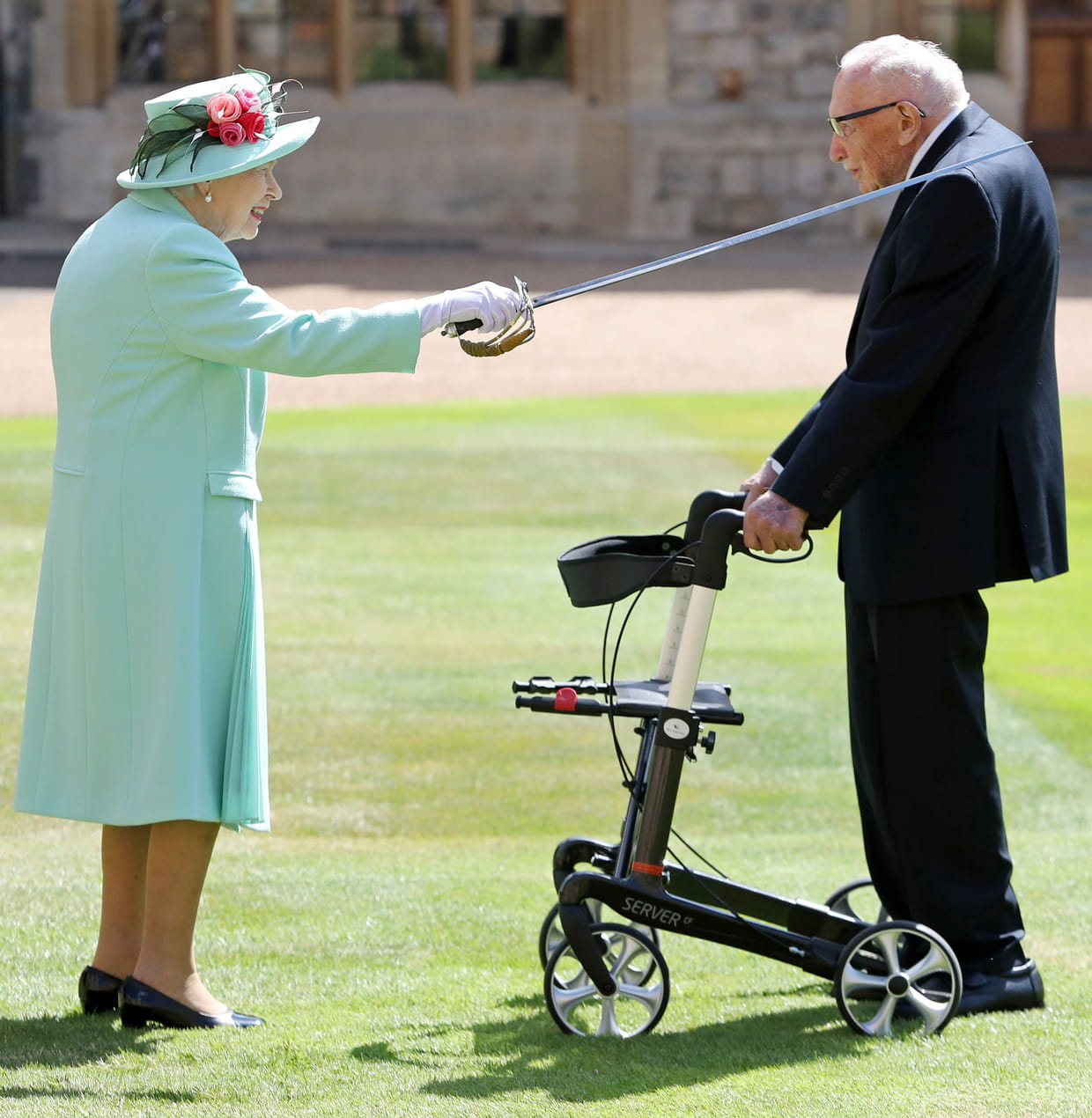 Ici, la reine Elisabeth II adoube au rang de chevalier Tom Moore,  100 ans et vétéran de la Seconde Guerre mondiale ayant récolté pas moins de 33 millions de livres pour les services de santé britanniques,  le 17 juillet à au château de Windsor.